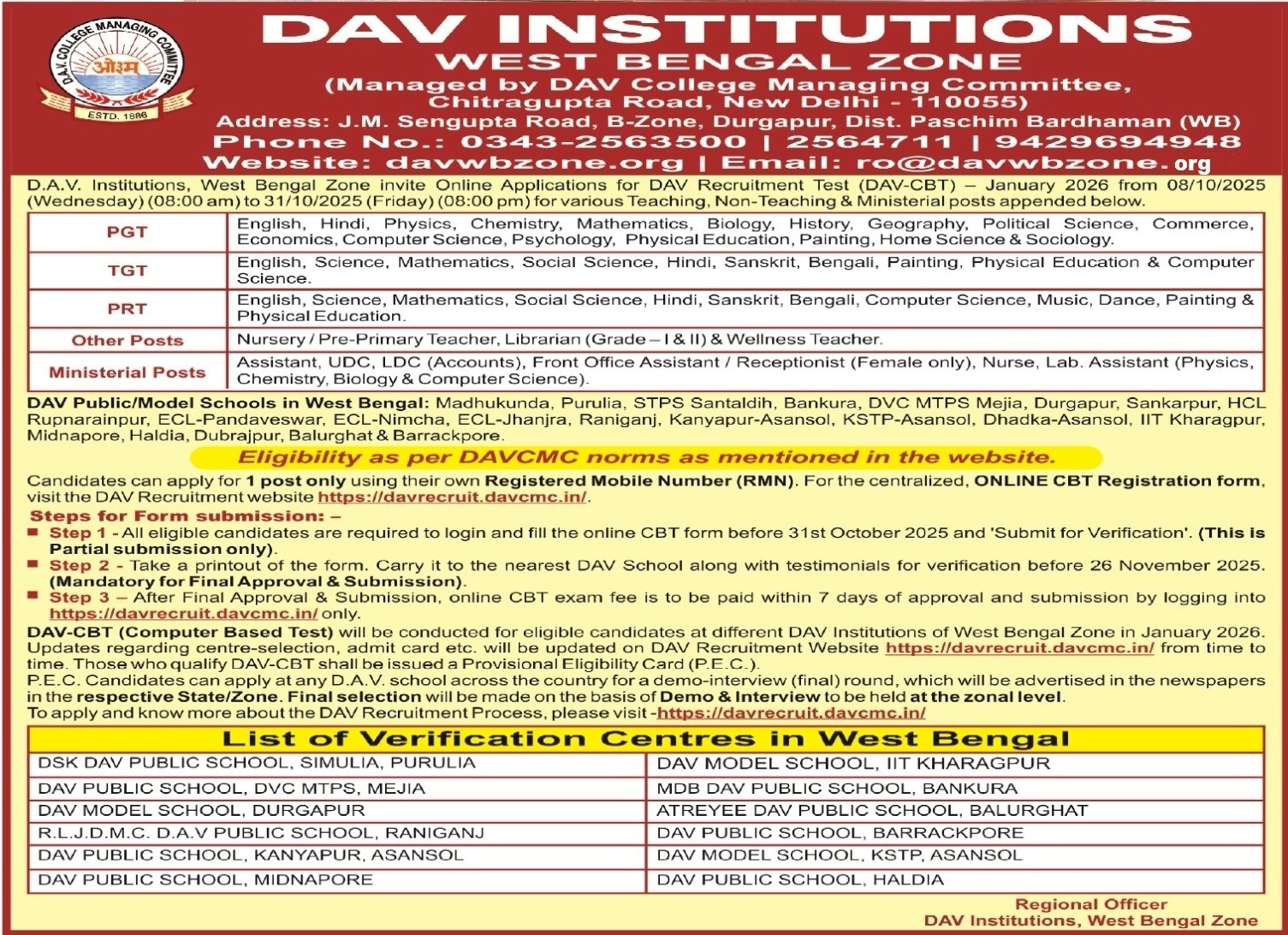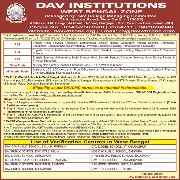 The D.A.V. Schools, are directly managed by the D.A.V. College Trust and Management Society, New Delhi with the goodwill and co-operation of the local intelligentsia under the able guidance and leadership of a band of devoted Principals and their colleagues. D.A.V. Model School, is situated in the verdant Campus of IIT Kharagpur and is affiliated to C.B.S.E.